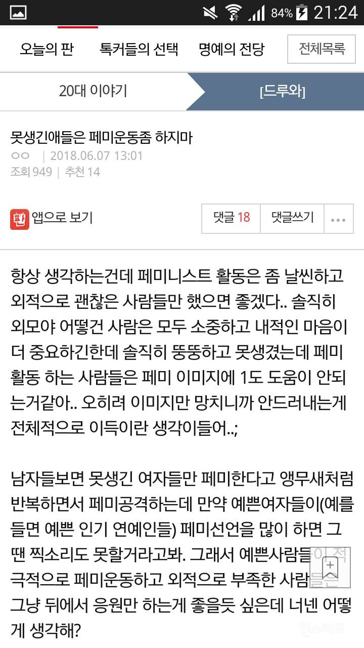 í미ì ìê¸°ë¥ Dogdrip Net ê°ë"립 from www.dogdrip.net 자기 말로는 페미랑 상관없이 사회 흐름이라는데내가 봤을 땐 그냥 페미임편의상 여사원a로 칭하겠음여사원a : 여자 외모 평가 하지말라는 페미 언냐들이 하는 남자 외모 품평회 (+사진) 2020년 7월 18일 / 카테고리: 1 한때 대한민국 표준국어대사전 에는 페미니스트의 둘째 용례로 '여자에게 친절한 남자를 비유적으로 이르는 말'이라는 설명이 있었다. 예쁘다느니 그런 외모 평가도 경각심을 줄겸요나. 자기 말로는 페미랑 상관없이 사회 흐름이라는데내가 봤을 땐 그냥 페미임편의상 여사원a로 칭하겠음여사원a : 21.04.26 22:52 238 0 신고 lipins7809 반박하는 글은 하나도 찾을 수 없었다. 요즘 대기업이나 공기업에서 성평등 교육 하는데 왜 우리 회사는 안 하나요나 :